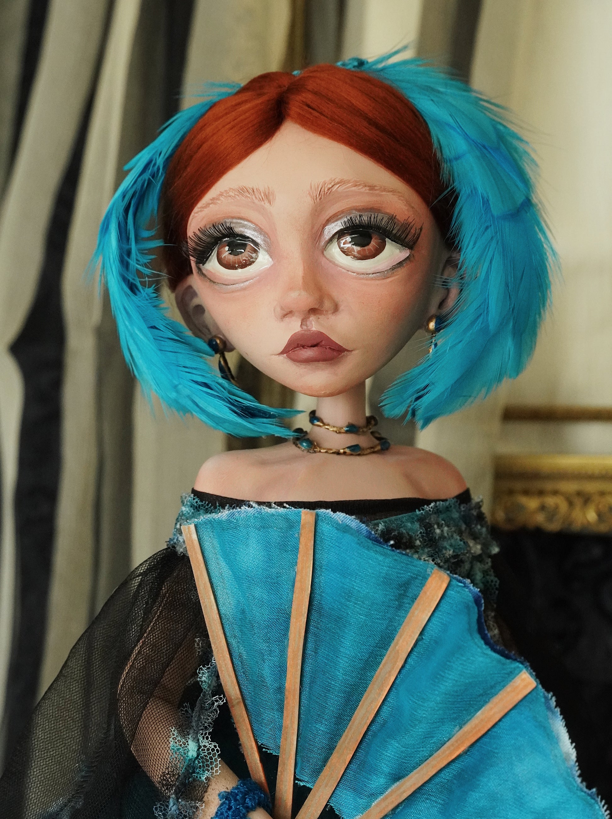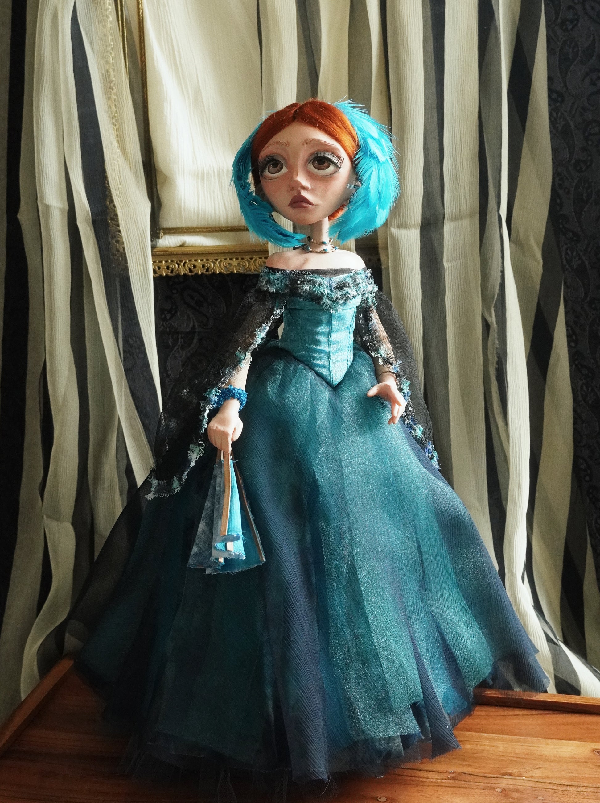 She is made with a hand-painted resin sculpture head, clay hands, clay shoulder, and a wire framed body.